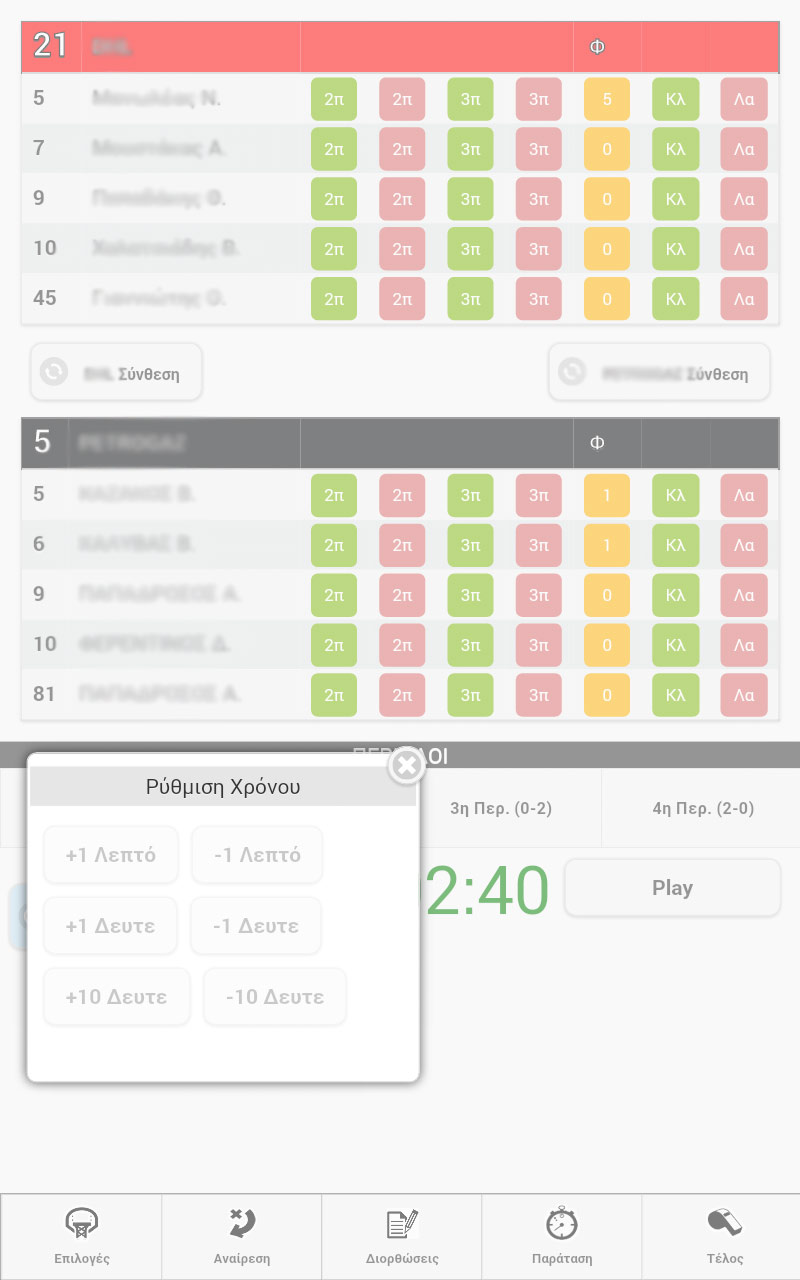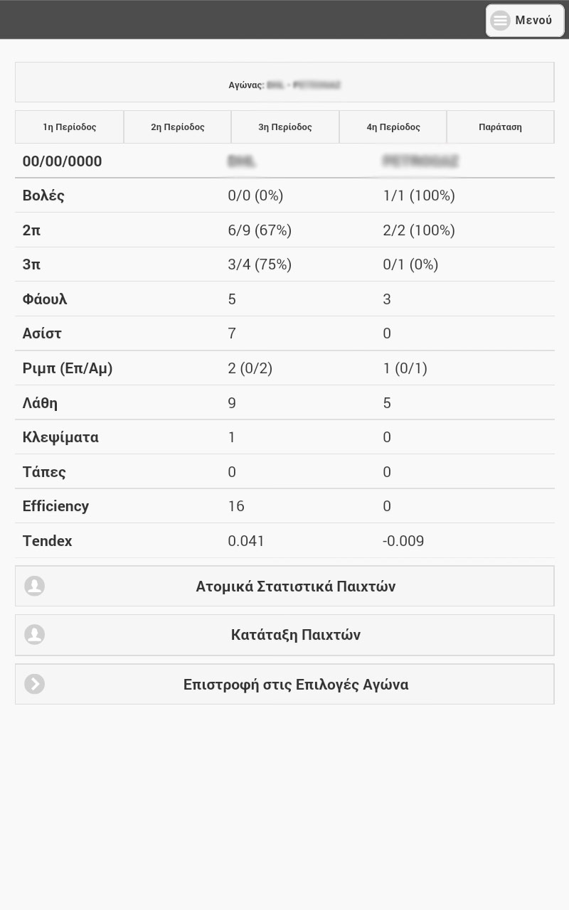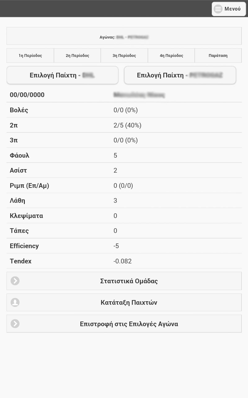 One of the features that make our solution stand out from competitive ones is time keeping and the designed methodology to do it. Timestartsautomatically right after recording any action like made shot, missed shot, rebound, steal, block, turnover and stops automatically when recording a foul or a free throw. There will always be a miss alignment with the official time keeping and this is why we have developed a time correction procedure to be used at time outs, intervals and player changes. During the above mentioned points the user can enter the exact time of the clock and in this way there is almost no loss in time keeping hence calculate with accuracy Tendex for each player.