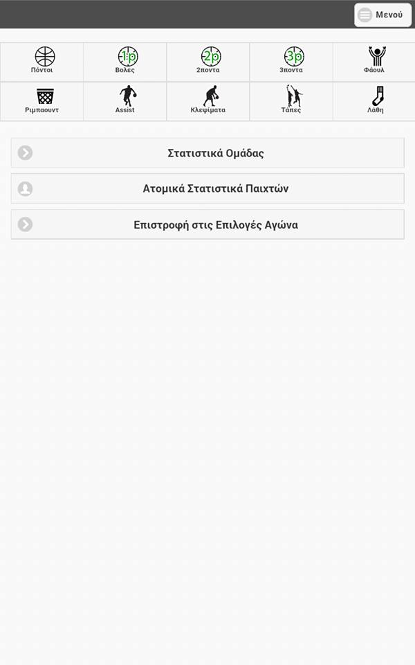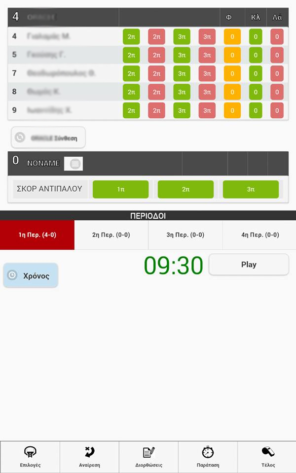 From the moment we choose to enter the roster of the opponent team and the details of each player (Players name, Players number), then the stats collection menu looks like the above screen shot and enables the user to collect stats for both team players.If we choose not to enter the details of the opponent team, then the game will only enable the user to record the score for the opponent team with the use of the buttons (1p, 2p, 3p) as shown in the second screen shot.
