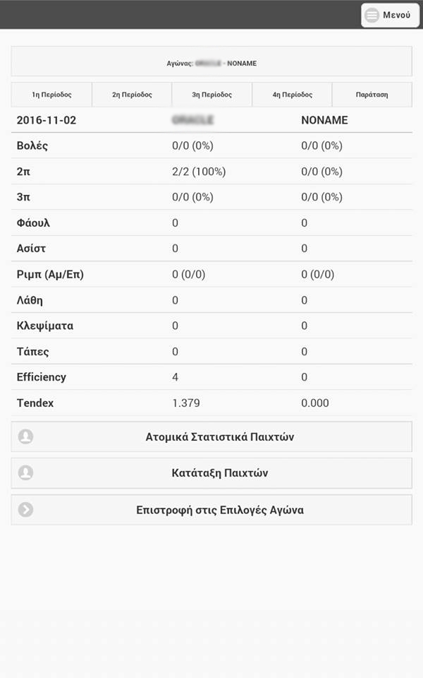 From this menu we can view the statistics of each player or the team, per period or for the whole game.- Team Statistics (We can view the team statistics)